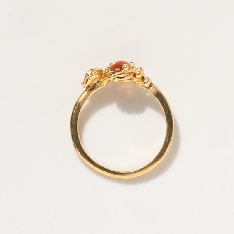 ぎゅっと元気を詰め込んでみました、という言葉がぴったりなサンストーン。サンストーンもこの内包物の入り方でピース毎に個性が非常に実は出る石で、角度を変えるたびにキラキラ。。と内包物が輝いてくれるため、リングにするととっても相性が良いなと思っています。日常使いもしていただけるよう、シンプルなリング腕デザインで仕上げました。