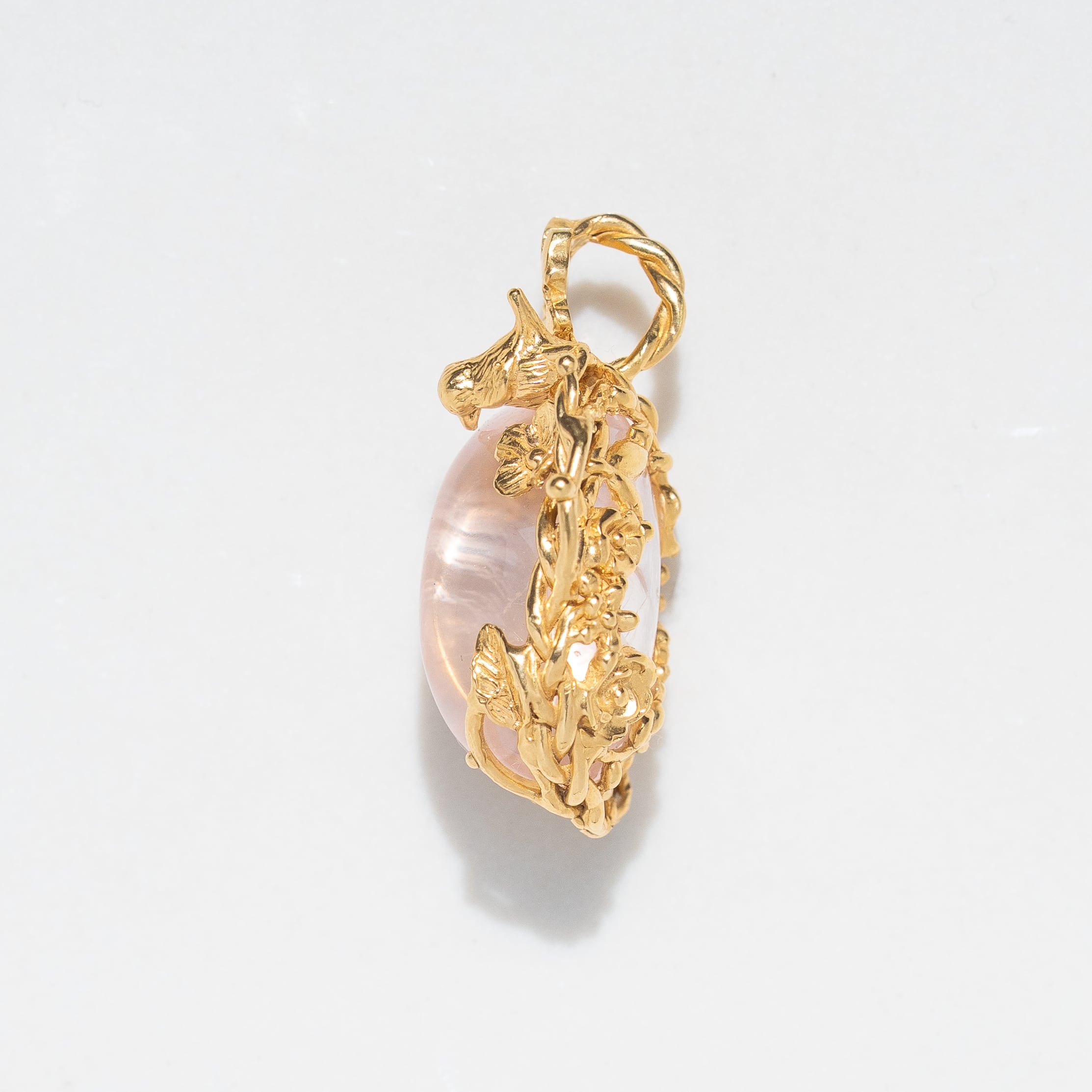 アイリスクォーツでローズクォーツというのも珍しいのですが、非常に美しくアイリスが入り込んでいます。そしてこのペンダント見て頂きたいのは実は裏側。裏面のアイリスの入り方が美しすぎて惚れ込んだピースなんです。そのためその部分が目立つよう裏側のボタニカルのデザインを仕上げています。