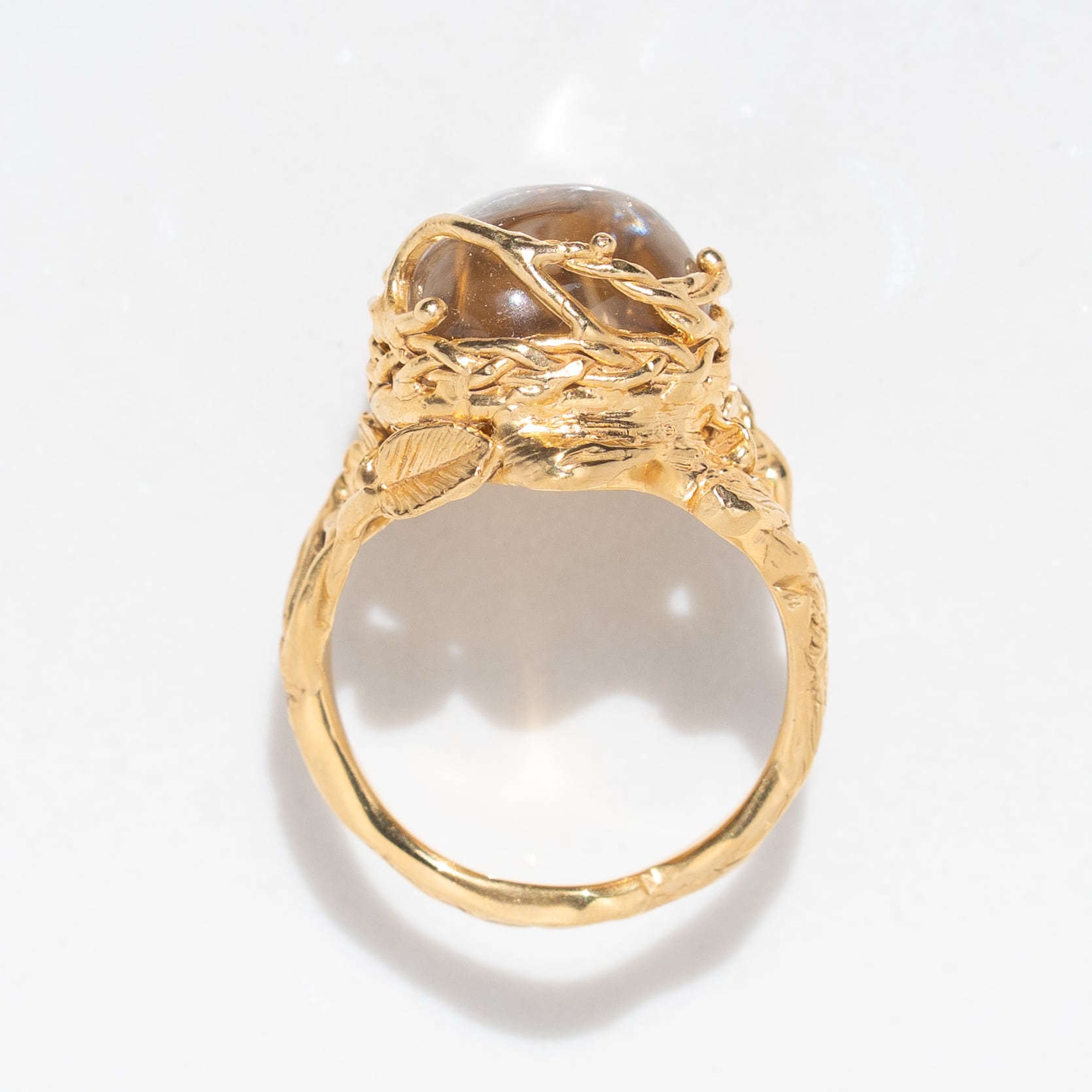 このリングは、高さは正義!という言葉が一言目には出てくる作品。ですが、実は着け心地は非常に良く指に馴染みます。アイリスクォーツの特徴である虹と角度を変えるたびに表情豊かに目が合います。唐草のデザインで包み込んで留めることで、ゆりかごのような印象に仕上げました。