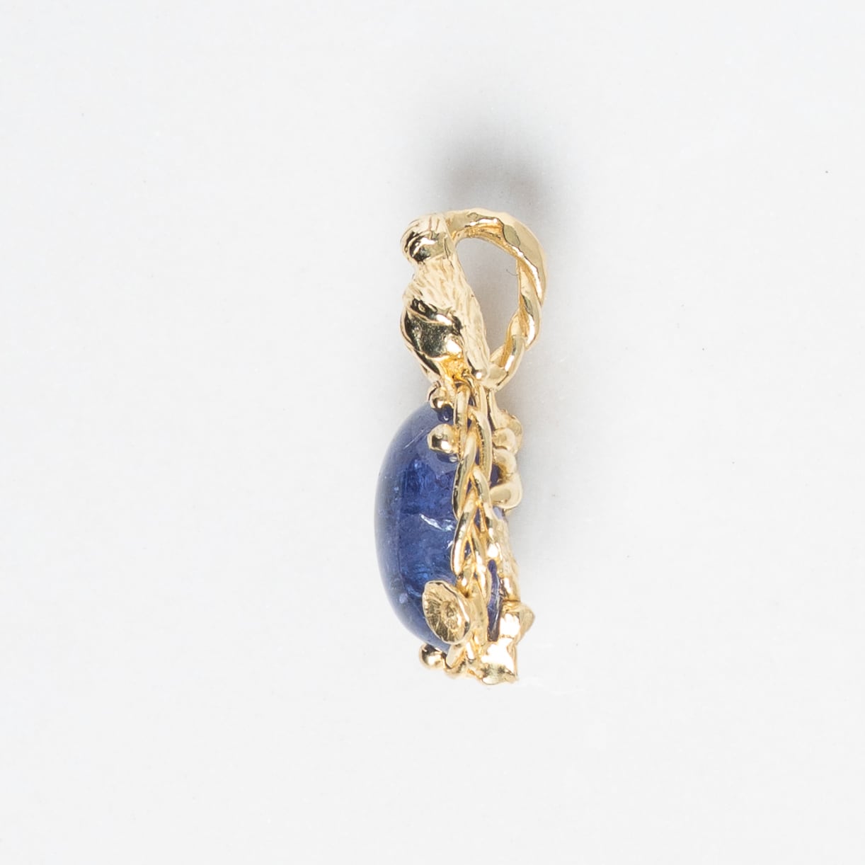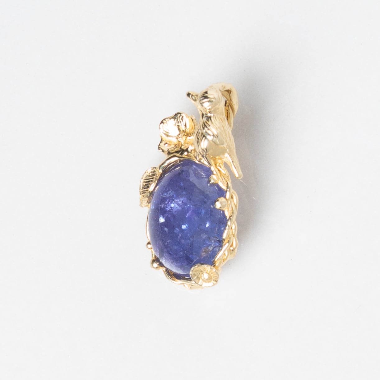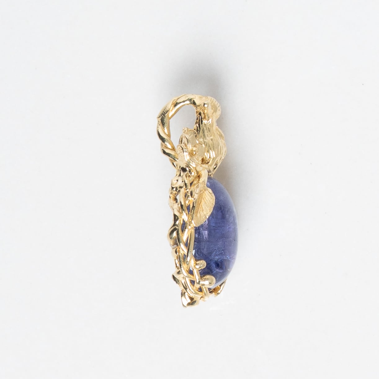 多色性のあるタンザナイト。艶やかなブルーが美しかったため、表は極力覆い隠さずその代わり裏面は夜の森の情景が浮かぶデザインに仕上げています。
