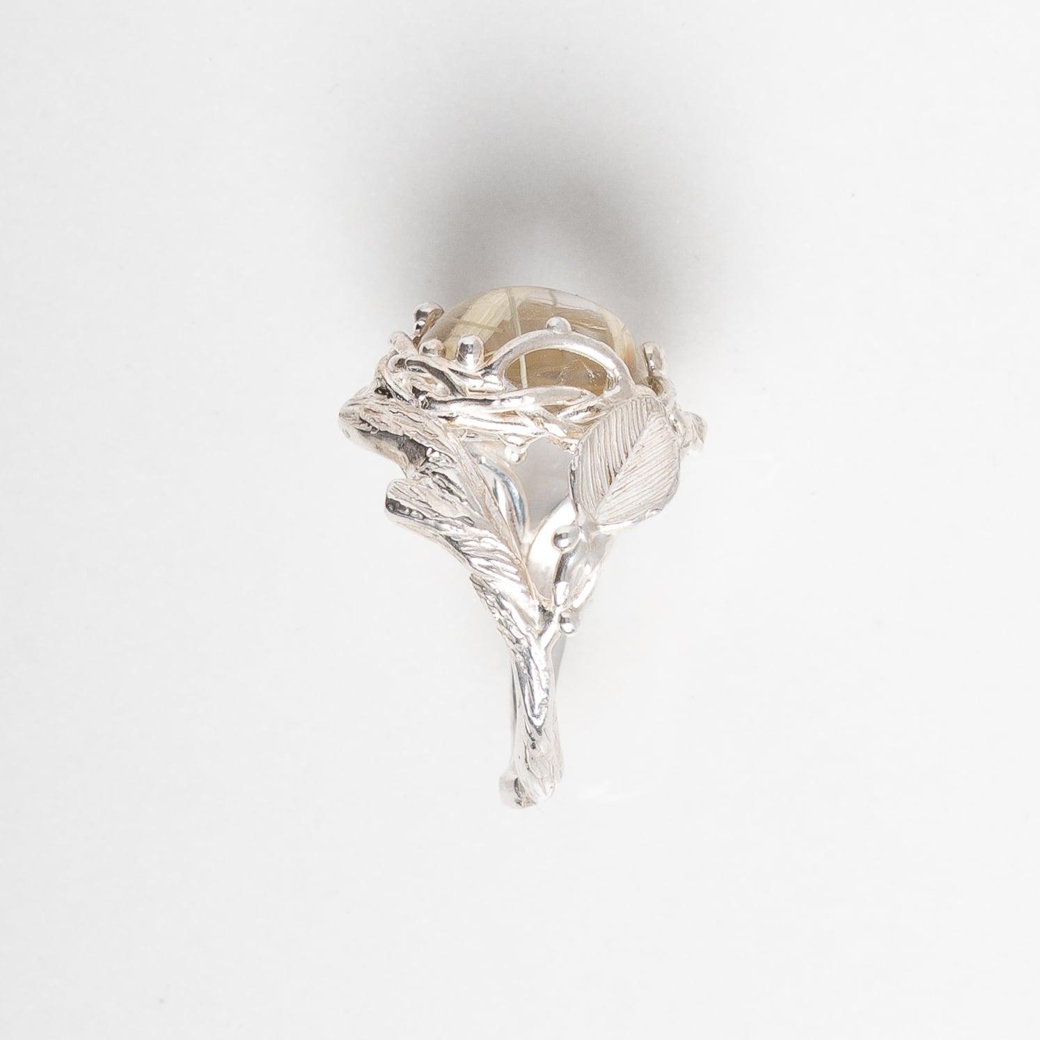 大変透明感の高いルチルクォーツ、真っ直ぐと伸びやかなルチルの線が2本入っておりスタイリッシュな印象を持たせてくれます。普段ルチルクォーツはゴールドカラーで仕上げることが大変多いのですが、かっこよさが際立つピースでしたのでシルバーでキリッと仕上げました。