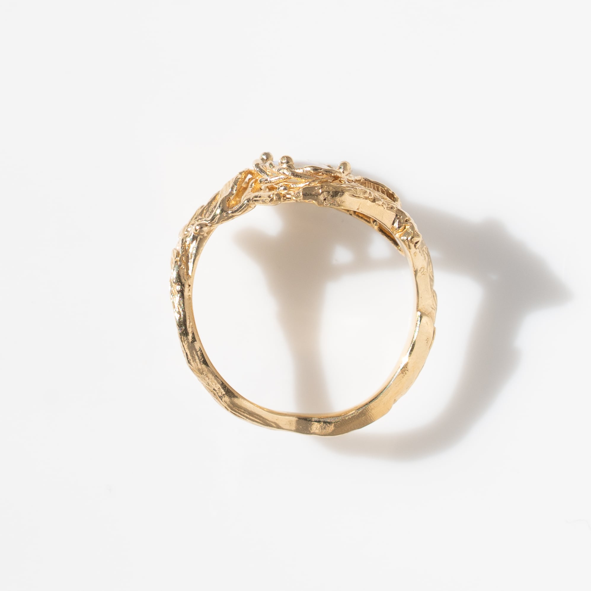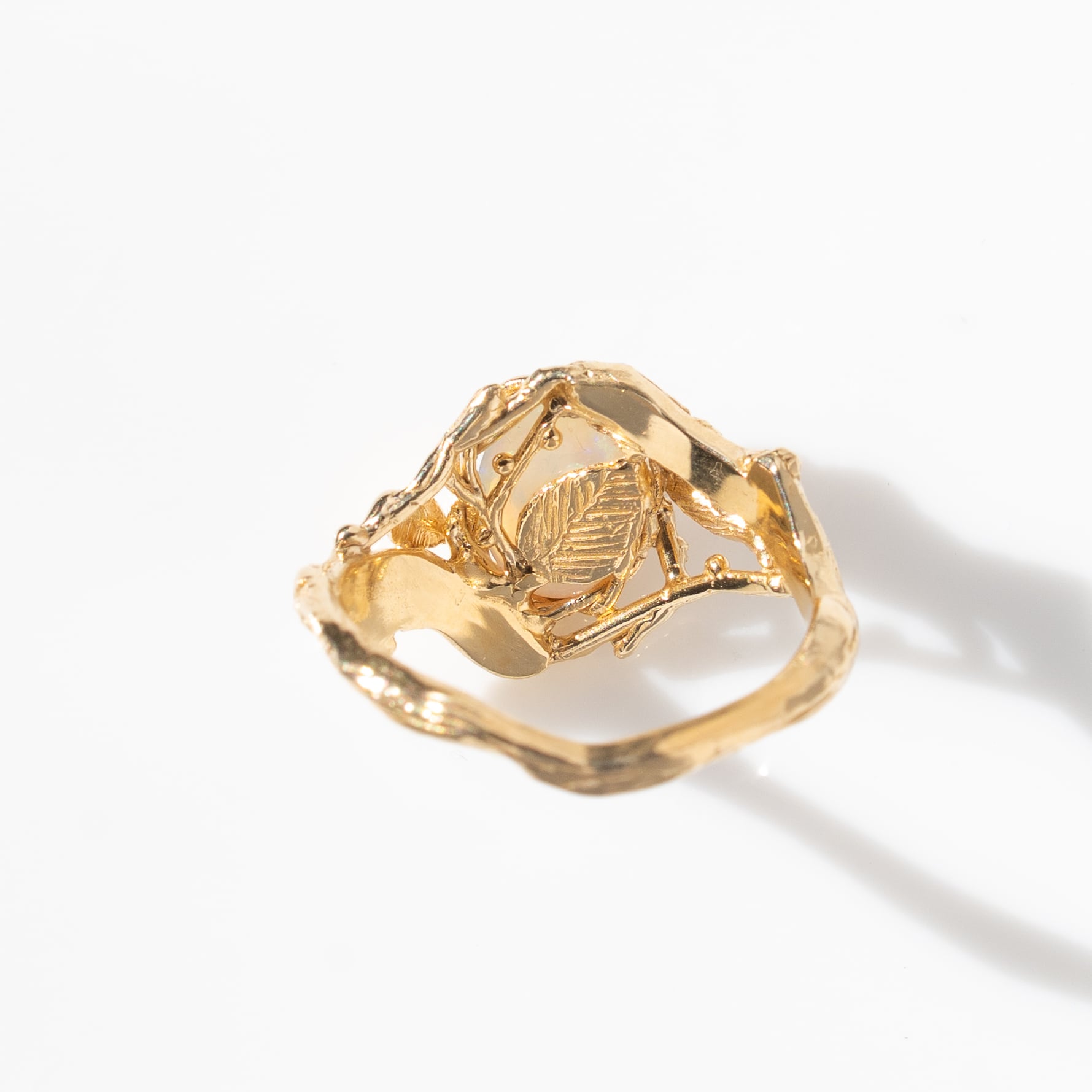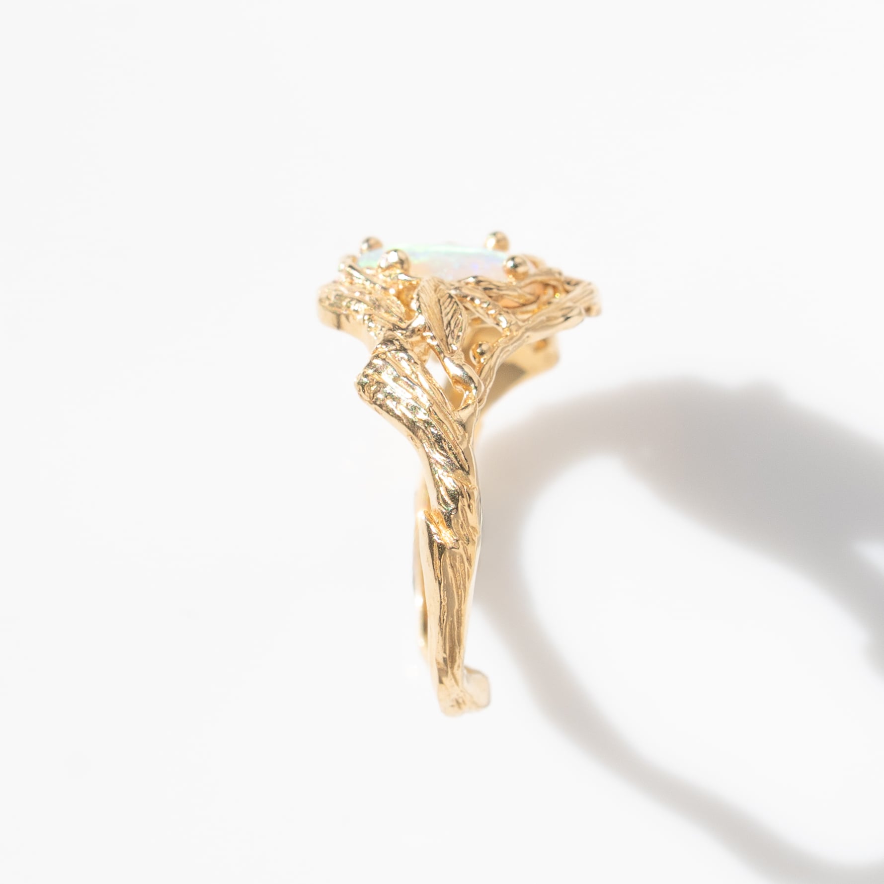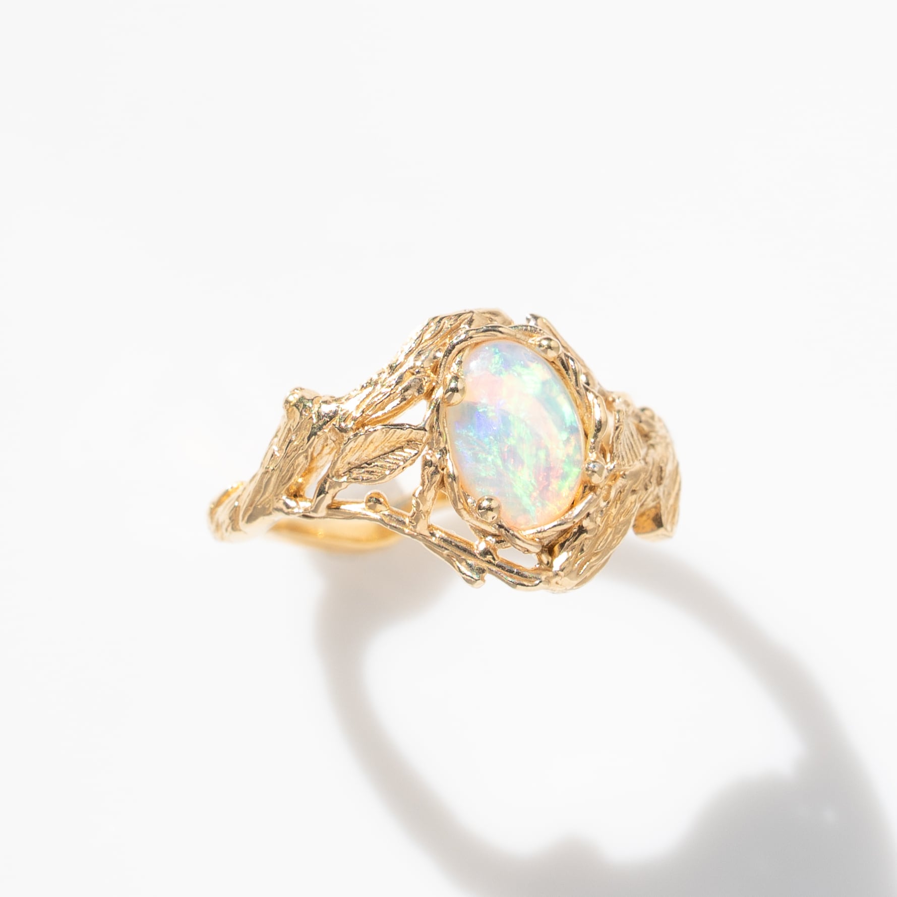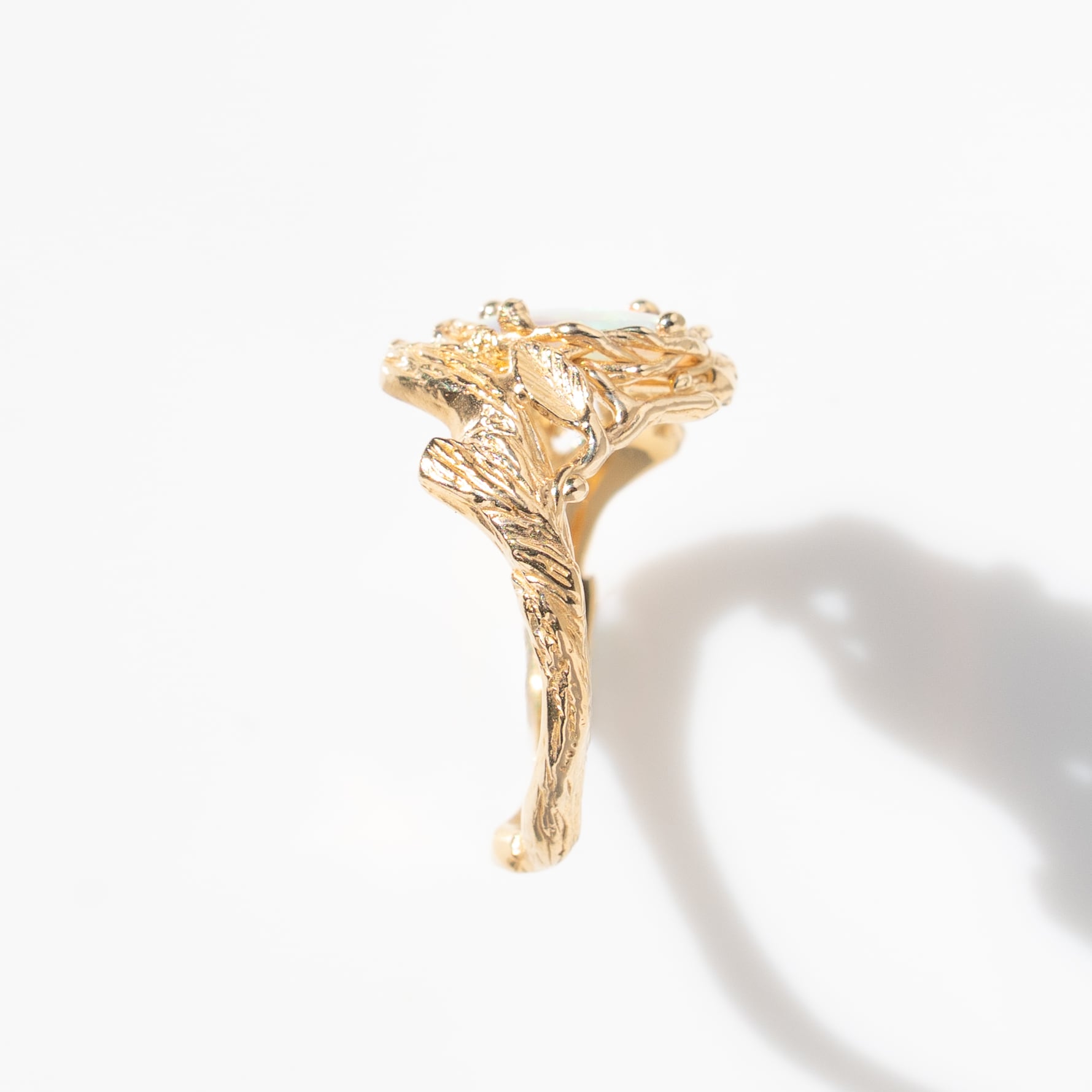 石が小振りで繊細でも、大ぶりのデザインをしてみたい、という着想から生まれたこのオパールリング。