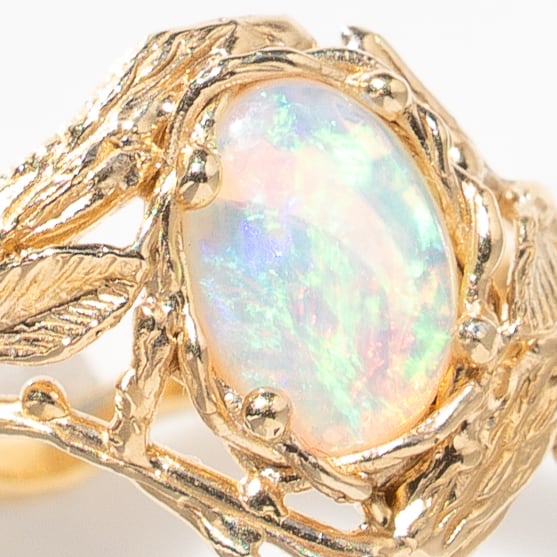 細やかな遊色が大変美しいホワイトオパールにリーフやつる草をあしらい、幅のあるデザインに仕立てました。